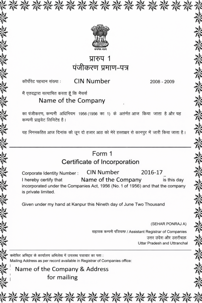 After successful registration, the Registrar of Companies issues a Certificate of Incorporation, which serves as legal proof of the company’s existence. It contains the company name, CIN, date of incorporation, and MCA seal.