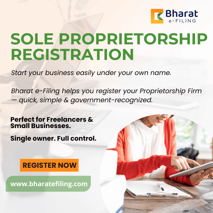 Start your Sole Proprietorship effortlessly with Bharat e-Filing. Ideal for solo entrepreneurs, freelancers, and small traders, we handle GST, Udyam (MSME) registration, trade licenses, and bank account setup—ensuring legal compliance, credibility, and hassle-free operations.